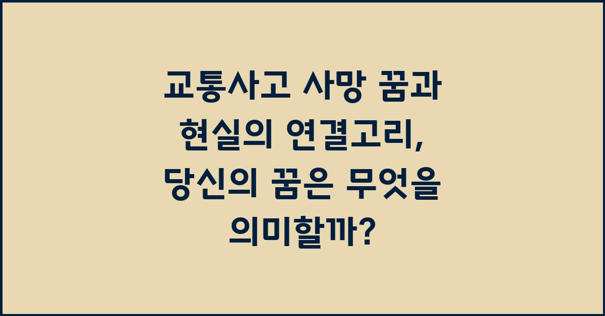 교통사고 사망 꿈과 현실의 연결고리 | 꿈해몽 꿈풀이 꿈해석 꿈의미를 통해, 우리는 꿈이 가진 다양한 의미를 탐구하고 우리의 삶에서 어떻게 적용할지를 이해할 수 있습니다. 꿈은 단순한 환상이 아닙니다. 그것은 내면의 감정과 현재의 삶을 비춰주는 거울이기도 합니다. 그래서 이러한 꿈을 통해 자신을 더 깊고 넓게 이해하는 기회를 가지세요.