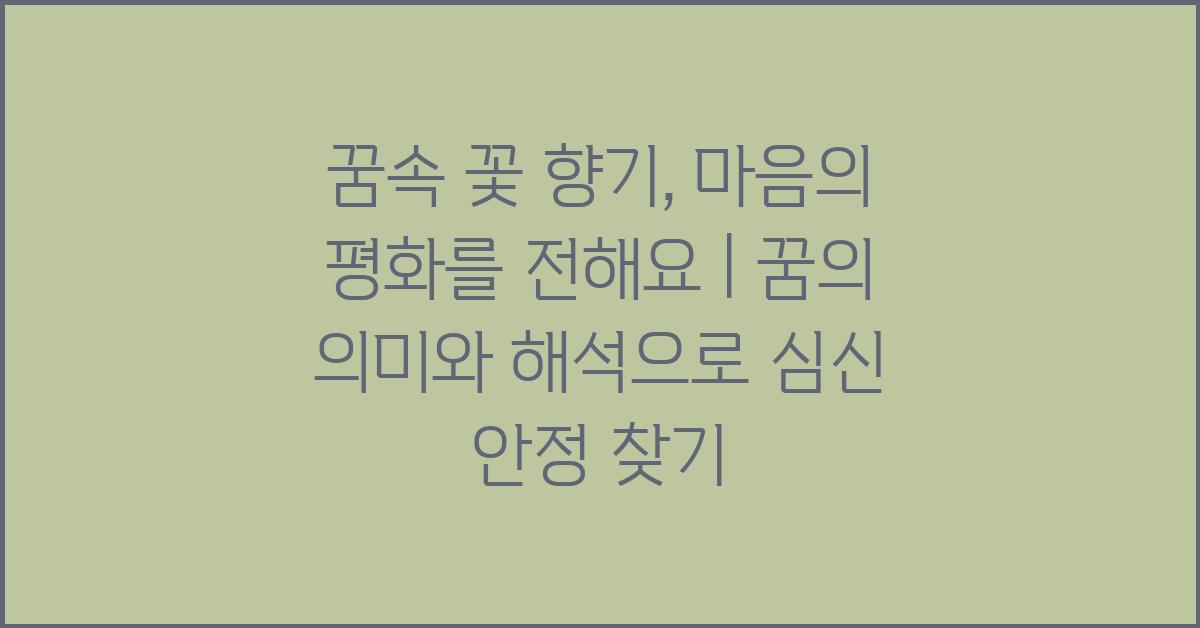 꿈속 꽃 향기는 단순히 아름다움의 상징이 아닙니다. 이 향기는 우리 마음속 깊은 곳에 자리 잡은 감정과 생각을 반영합니다. 꿈에서 꽃이 필 때, 그것은 우리 내면의 평화와 안정감을 찾아가는 과정을 상징할 수 있습니다. "꿈속 꽃 향기, 마음의 평화를 전해요 | 꿈해몽 꿈풀이 꿈해석 꿈의미"라는 말처럼, 꿈에서 느낀 향기는 우리가 현재 처한 문제를 해결하는 데 도움을 줄 수 있습니다.