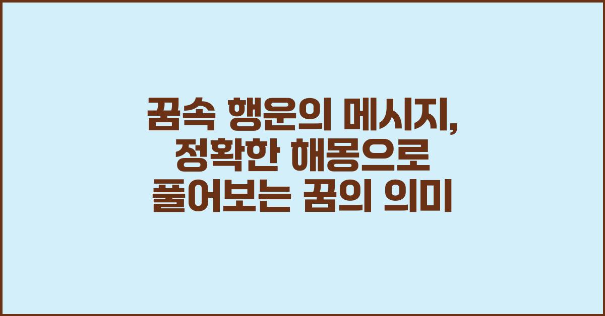 꿈속 행운의 메시지, 정확한 해몽 | 꿈해몽 꿈풀이 꿈해석 꿈의미는 우리 인생에서 해결할 수 없는 많은 문제와 미스터리를 풀어줄 수 있습니다. 꿈은 우리의 무의식과 감정, 그리고 일상에서 느끼는 여러 가지 스트레스가 얽혀 있는 신비로운 세계이기 때문이죠. 꿈을 통해 우리는 자신이 모르는 내면의 소리를 듣고, 잊고 있었던 소망을 재발견할 수도 있습니다. 여러분은 꿈을 통해 어떤 메시지를 받은 경험이 있나요? 꿈이 주는 의미는 정말로 다양하고 그 해석 또한 무궁무진합니다.