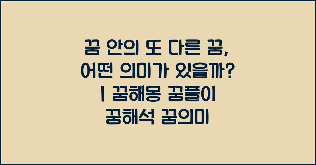 꿈 안의 또 다른 꿈, 해석과 의미 찾기 | 꿈해몽 꿈풀이 꿈해석 꿈의미는 단순한 환상의 세계가 아닙니다. 그것은 우리의 심리 상태와 감정을 반영하는 중요한 창구입니다. 꿈을 통해 자신을 더 잘 이해하고, 상대방과의 관계를 재조명해보는 의미 있는 시간을 가져보세요.