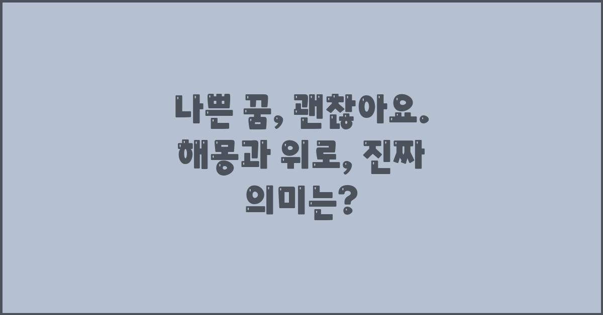 해몽은 단순히 꿈의 내용을 분석하는 것 이상의 의미를 갖습니다. 우리가 통상적으로 나쁜 꿈을 꾼 후 깨닫는 것은, 단순히 흥미로운 사실들이기에 다른 사람과 이야기를 나누게 됩니다. 그 과정에서 나누는 위로는 소중한 연결의 경험을 주기도 하죠. 나쁜 꿈, 괜찮아요. 해몽과 위로에는 이러한 차원에서의 의미가 포함됩니다. 해몽을 통해 여러분은 내 마음의 이야기를 듣고 이해하게 되는 시간을 갖게 될 것입니다.
