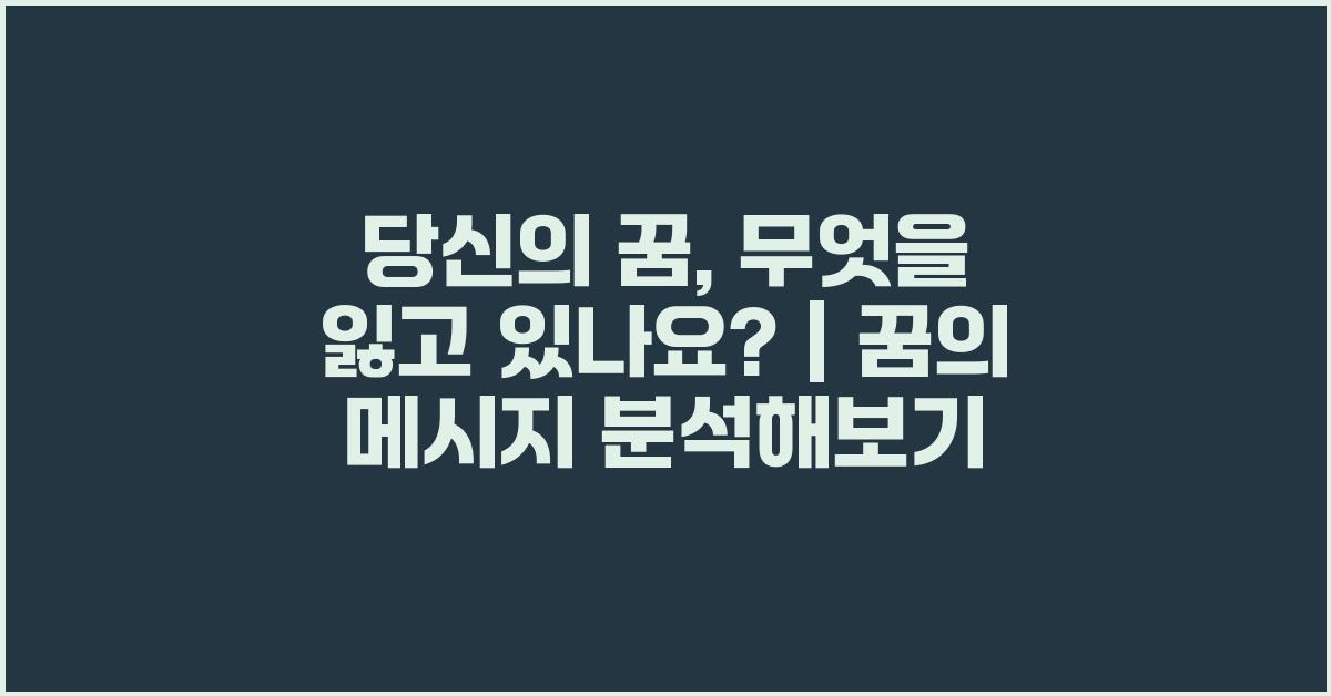 꿈은 우리 내면의 소리를 담고 있다. 많은 사람들은 꿈을 통해 숨겨진 욕망이나 두려움을 표현한다. 여기서 중요한 질문은 "당신의 꿈, 무엇을 잃고 있나요?"라는 것이다. 꿈의 메시지를 이해하고 분석하는 과정은 자신의 내면을 들여다보는 데 도움을 줄 수 있다. 꿈속에서 나타나는 상징들은 우리 인생의 여러 측면을 반영하며, 이들을 해석함으로써 우리는 잃어버린 것들을 다시 찾을 수 있는 기회를 얻는다.