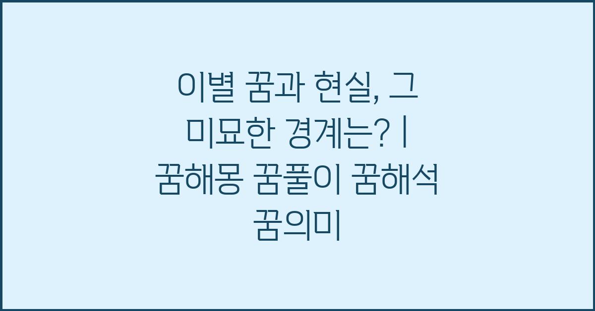 꿈과 현실은 때로 구분하기 어려운 경계를 가집니다. 예를 들어, 우리가 꾼 이별에 관한 꿈은 현실에서의 감정과도 얽히고 설키어 있습니다. 꿈속에서의 이별은 우리 내면의 갈등이나 불안감을 표현한 것일 수 있으며, 현실에서의 경험과 밀접한 관계를 가지고 있습니다. 이처럼 이별 꿈과 현실, 어떻게 연결될까? | 꿈해몽 꿈풀이 꿈해석 꿈의미는 흥미로운 주제입니다.